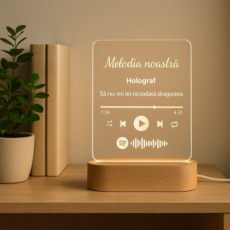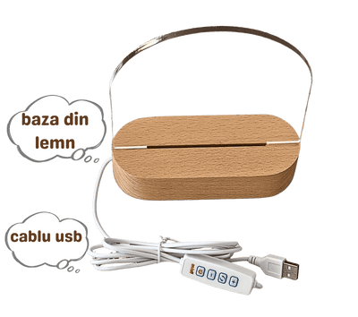 Fiecare lampă este din lemn natural de fag cu textură si nuanțe proprii - nu există două la fel. Luminozitatea dar si nuanța luminii poate fi selectată din telecomandă: caldă, rece sau neutră. Placa transparentă este de acril - deci nu se sparge. Gravura este facută cu laser. Se conectează prin cablu USB, fără baterii.