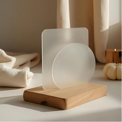 Fiecare bază este din lemn natural de fag, cu textura și nuanță unică. Asta face ca fiecare lampă să fie diferită și mai specială. Placa de deasupra este realizata din acril turnat, un material deosebit de clar si de rezistent.